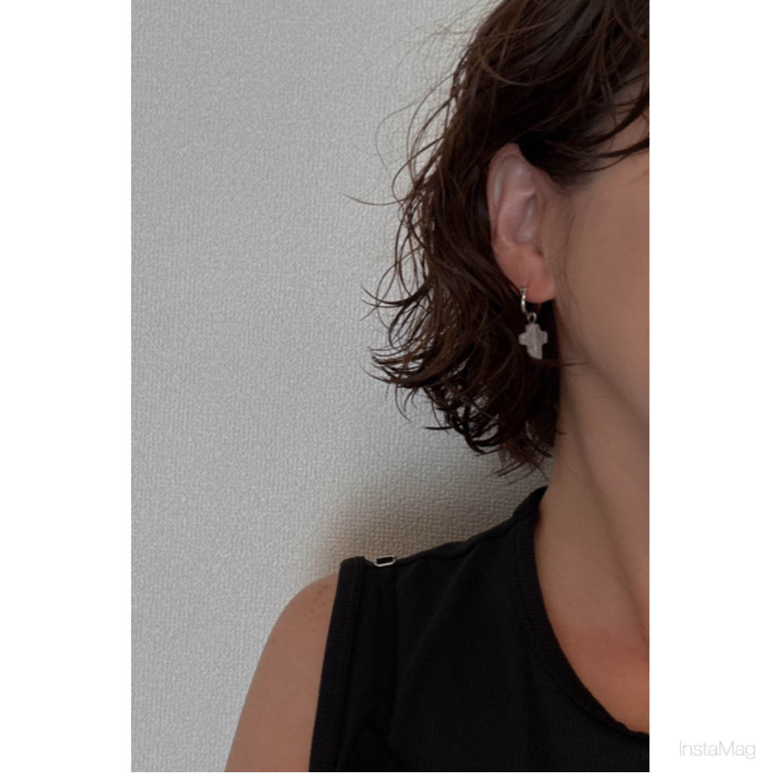 クリスタルの小さめなクロスに小さなシルバーのフープピアス。