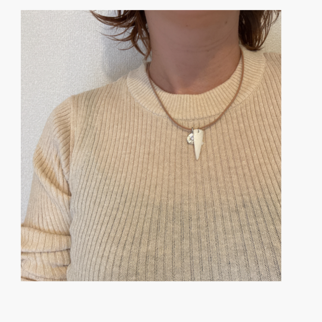 牙のような形のシェルとジルコニアの入ったスターモチーフチャームを合わせたシンプルな革紐ネックレス。